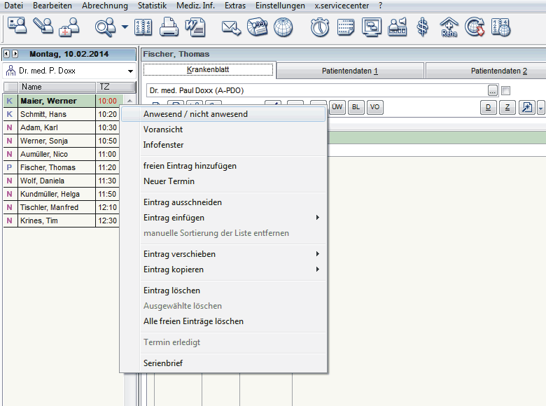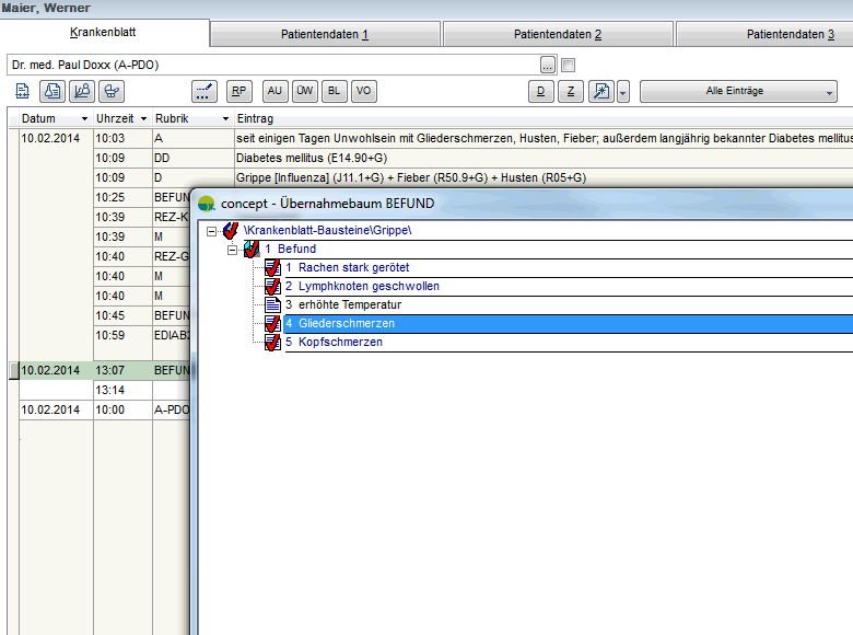 Dr. Doxx begrüßt Herrn Maier und untersucht ihn. Die Diagnose: Herr Maier hat eine mittelschwere Grippe. Dr. Doxx nutzt den professionellen Workflow- und Dokumentationsmanager: Mit nur zwei Mausklicks kann er die komplette Befunddokumentation für Herrn Maier in seiner Praxissoftware durchführen: Von der Anamnese über die Ziffernerfassung bis zur Arztbriefschreibung.
