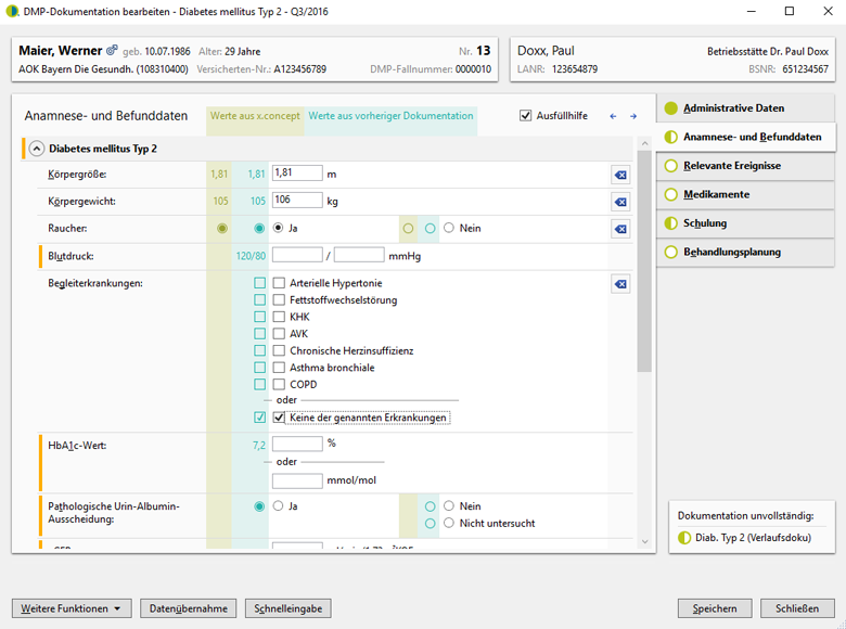 Im Rahmen der regelmäßigen Routine-Kontrolle 14 Tage später untersucht Dr. Doxx Herrn Maier gründlich. DMP-Verträge verlangen eine fundierte Dokumentation: In x.concept kann Dr. Doxx per Mausklick die vorherigen Dokumentationen in der Praxissoftware einsehen sowie Daten und Diagnosen übernehmen. Das gibt ihm einen direkten Vergleich und spart Zeit. Weil Herr Maier an Gewicht zugenommen hat, empfiehlt Dr. Doxx dringend eine Ernährungsberatung und vereinbart den nächsten regelmäßigen Kontrolltermin.